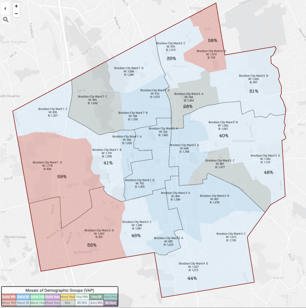 The one-sentence take-away is that just three (3) of Brockton’s twenty-eight (28) precincts are majority white. I think most people assumed – like I did – that Brockton’s core (the “A” precincts et al) are predominantly Black and brown but that the outer edges of the city were still majority white. That’s really not the case except for the three exceptions – Brockton has rapidly become a much more diverse city in all precincts – its just a question of degree.