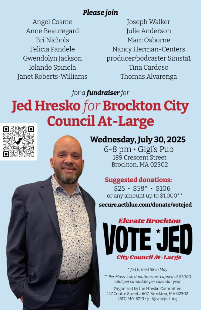 Join me and friends, family, neighbors, supporters & volunteers at my fundraiser for my run for Brockton City Council At-Large. Wednesday July 30 6-8 pm at Gigi’s Pub in Brockton.