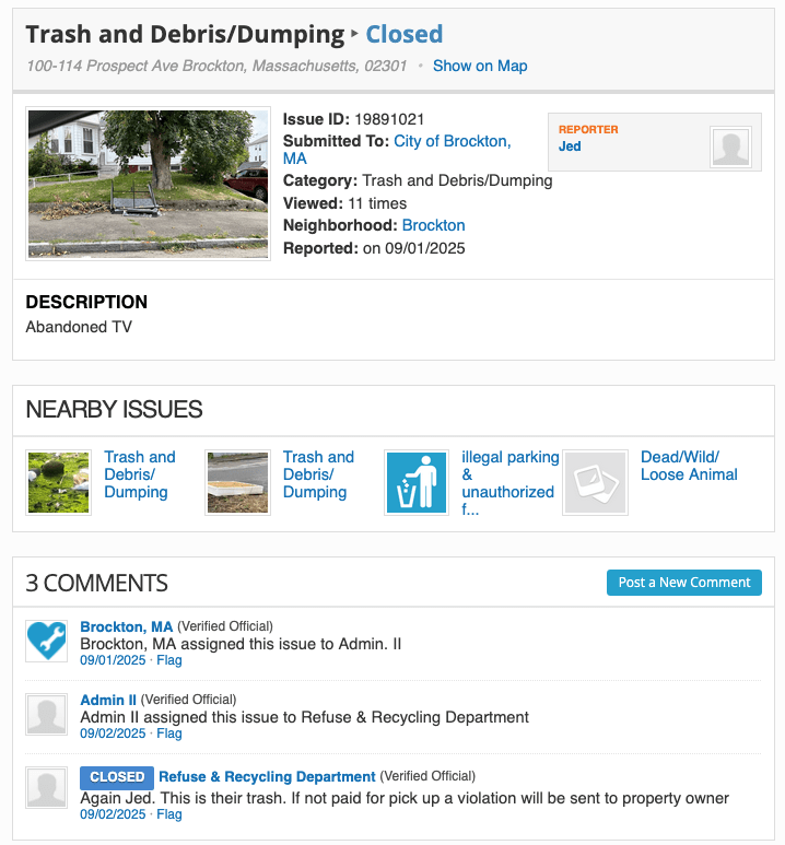 Every time I go canvassing (knocking on voter doors) I take pictures of issues I observe. I’ve filed 164 total See Click Fix reports – with 109 filed in 2025. Recently the staff on the other end started getting snippy with me – trying to make excuses or tell me I filed the wrong kind of report. This, while they’re closing tickets without actually having resolved the issue!